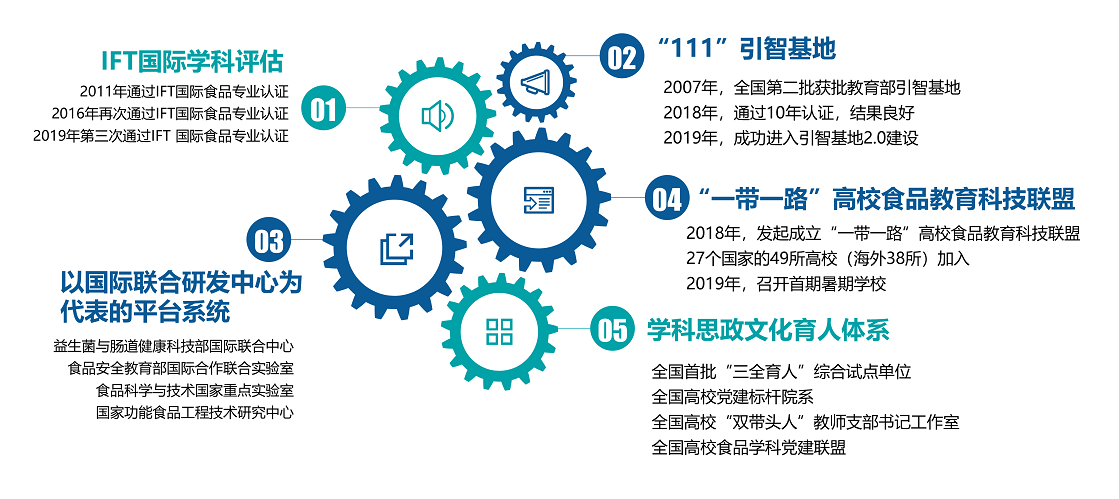 williamhill始终坚持教育对外开放高质量内涵式发展,以培育具有全球胜任力的人才为奋斗目标,与美国、荷兰、新加坡、新西兰等国家多所科研院校建立了稳定的科研合作和人才交流。人才培养方面 2011年,食品科学与工程专业成为国内首家通过IFT食品专业国际认证的专业。2020年获批williamhill威廉希尔-新西兰梅西大学食品科学与工程专业教育部中外合作办学项目,与新加坡国立大学、芬兰图尔库大学、英国雷丁大学等建有联合培养项目。合作平台方面 “111引智基地”成功运行十年,在2019年获批进入引智基地2.0建设。国际联合实验室方面 以教育部国际合作联合实验室和科技部国际联合研究中心”2个国家级国际联合实验室领衔,建构了8个校级国际联合实验室以及8个院级国际联合实验室,形成“2-8-8”学科全覆盖模式。科研合作方面 获批国家自然科学基金委国际合作重点项目,科技部国际合作项目等国际合作项目4项,获国家科学技术国际合作奖1项,国家政府友谊奖2项。影响力方面 2018年,发起成立“一带一路”高校食品教育科技联盟,27个国家的49所高校包括38所海外高校加入,广泛开展员工交流、团队互访、合作科研等相关工作。与Elsevier合作主办的学术期刊Food Bioscience于2013年正式创刊,目前影响因子4.24。2015年以来,学院成功举办23场国际(双边)会议,共有457人次的海外专家学者来公司访问交流,117人次专家学者受邀做专题报告,14人次专家学者进行全英文授课。疫情期间,开展六期“williamhill威廉希尔-瓦赫宁根大学及研究中心未来食品云端系列论坛”,超2万人观看。