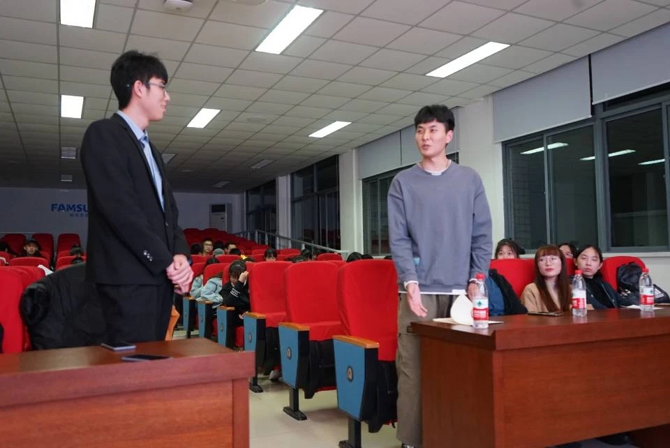 活动还邀请到了19届员工芮一犇,他毕业后参加“苏北计划”志愿服务项目,在盐城市盐东镇基层岗位服务了一年,他跟同学里分享了他由刚开始的懵懂无知、找不到方向到最后轻松应对、踏实工作的志愿服务过程,让同学们了解到基层虽然环境质朴无华,但是工作千头万绪、纷繁复杂,广袤天地需要青年,青年也只有在基层广阔天地中经风雨、见世面,才能壮筋骨、长才干。