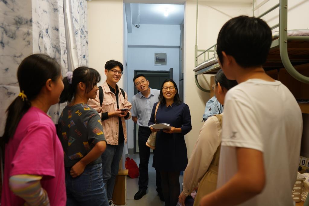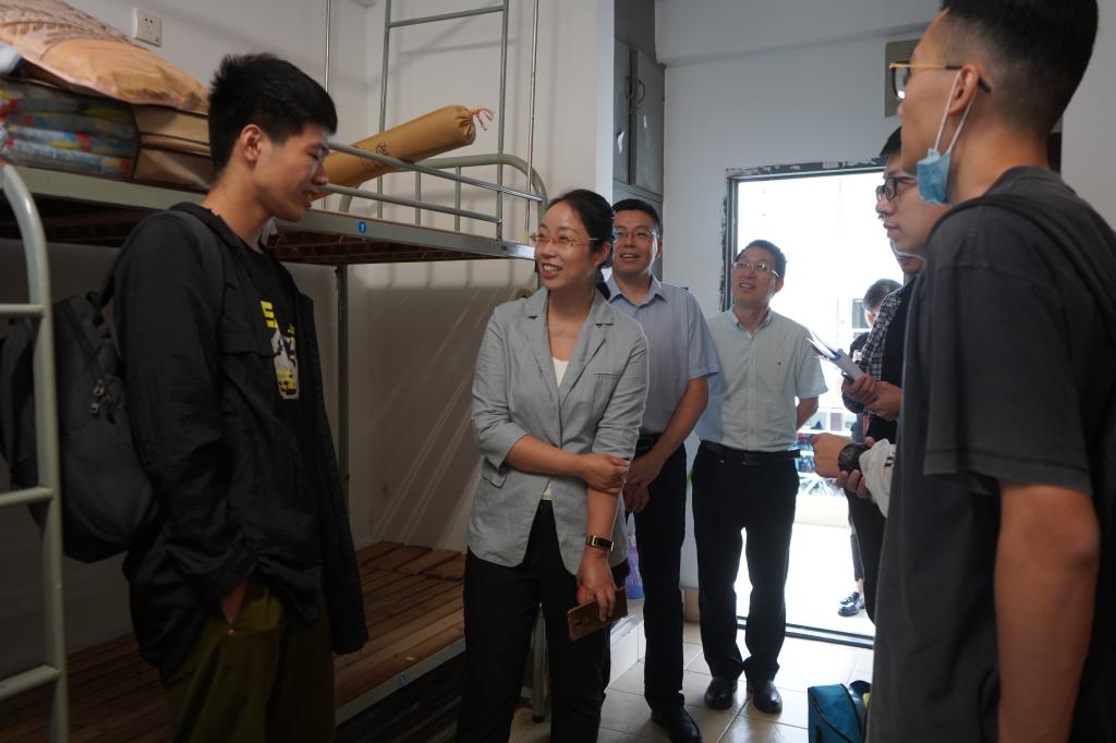 公司党委书记傅莉莉、副书记魏珍吉、副经理王立等第一时间前往宿舍园区看望新生。因为疫情缘故,新生都是独自入校报到,学院领导们特别关心他们的适应情况、报到是否顺利完成等,仔细查看了基础设施和环境卫生,深入寝室与新生展开亲切的交流。