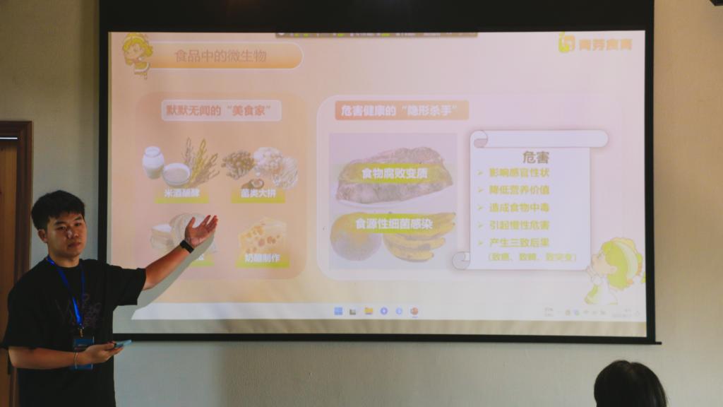 “为什么新鲜面包放进冷藏室,拿出来却不好吃了呢?”“为什么妈妈要将蔬菜和水果分开放呢?”一堂生动有趣的食育课在福鼎市乡村振兴工作站开讲,引发现场多名中小员工的踊跃问答,也让他们对食品,对人体与微生物有了更多的了解和认知。课堂上,实践团成员结合福建当地饮食特点,通过丰富的案例带领青少年们走入美味的食品世界,助其认识饮食与健康的关系,树立正确的膳食营养观念。