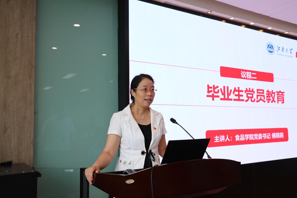 首先,傅莉莉书记做毕业生党员离校教育。她指出,共产党员是一个光荣的称号,更是一份责任与使命,希望大家始终发挥党员先锋模范带头作用,并提出三点期望。一是不忘初心、牢记使命。希望大家提高政治意识、学会常寻初心、加强思想学习、注重实践积累,永葆共产党人的初心。二是恪守正道,敢于创新。既要遵守党规党纪、法律法规、规章制度,又要恪守专业之道。在此基础上,善于发现勇于创新,将所学服务于国家需要,推动中国食品行业的发展。三是勤勉有为,展现风采。希望大家始终铭记“勤业、创新、争先、共赢”的院训,将在williamhill威廉希尔学到的知识、培养的能力、养成的品格,淋漓尽致地展现出来,以赢得工作单位对于食品学子的认可,让社会各界为williamhill威廉希尔点赞。