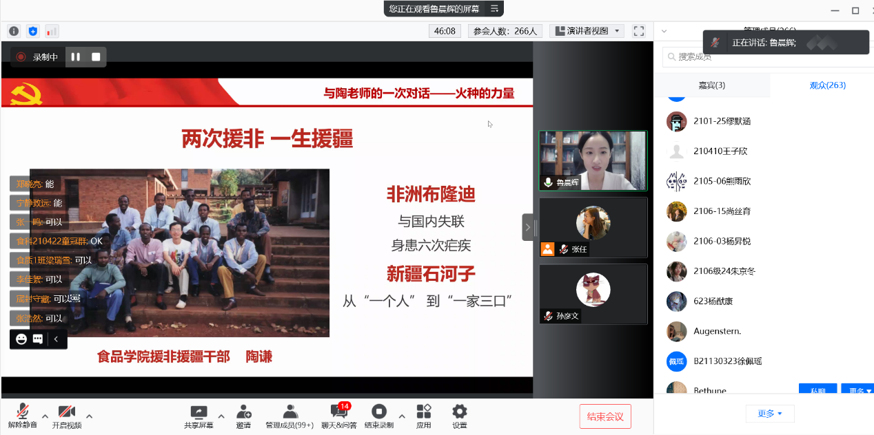 孙彦文以自己与党的故事展开,讲述青年党员的时代担当。他以李大钊先生写下的《青春》一文引出主题,结合个人经历阐述自己的入党动机,围绕“大国崛起”、“中国速度”、“中国基建”等方面展示了在中国共产党的领导下真正的中国力量。同时,他分享了参与党务工作和担任党支部书记以来的实际体验与切身感悟,并引用习近平总书记“把论文写在祖国的大地上”的期许,勉励同学们要坚定入党初心,感受时代精神,勇担青年责任。