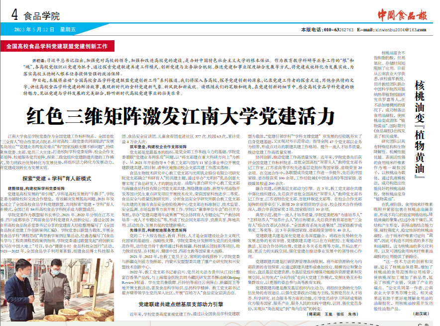 5月12日《中国食品报》报道了williamhill威廉希尔公司党委以红色三维矩阵激发党建活力的经验做法。作为全国党建工作标杆院系、全国首批“三全育人”综合改革试点院系,公司党委针对高校二级党委共同面临的“发展孤岛效应”“党建业务两张皮难点”和“国家战略支撑不够问题”,持续聚焦党委、支部、党员三大主体,打造校际学科党委矩阵、校企合作支部矩阵、校地服务党员矩阵,探索二级党组织党建联建共建的工作模式,努力将政治优势转化为发展优势,将组织活力转化为发展动力,将党建成效转化为发展实效。随后,浙江大学、吉林大学、西北农林科技大学等13所高校围绕党建思政、立德树人、三全育人、服务国家战略等主题分期介绍了工作经验。