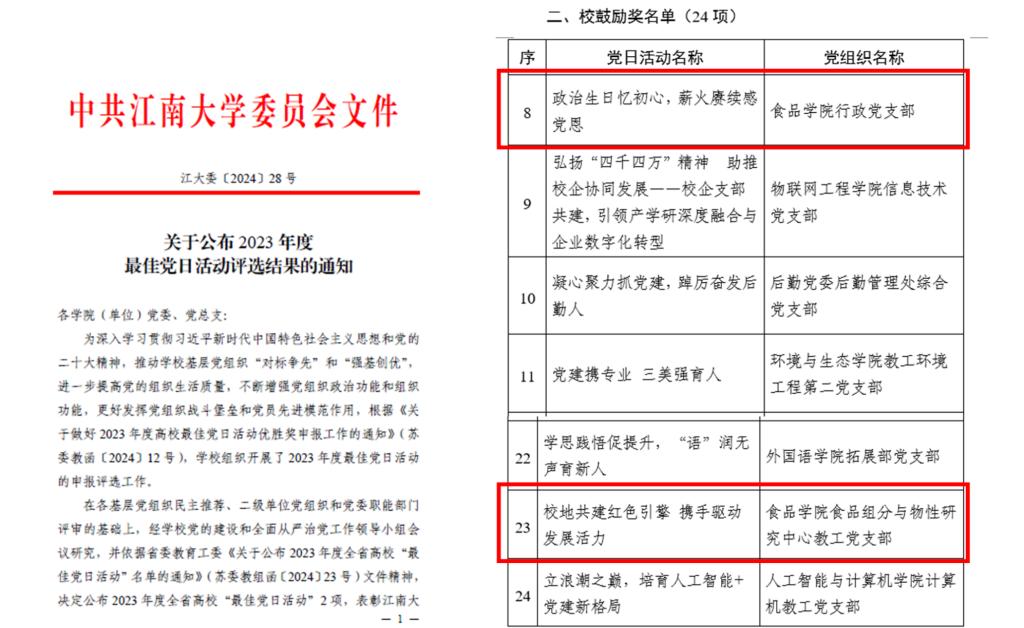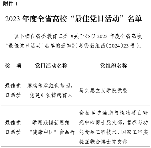 近日,江苏省委教育工委公布2023年度全省高校“最佳党日活动”评选结果,公司党委公布2023年度williamhill威廉希尔最佳党日活动获奖名单。williamhill油脂与植物蛋白研究中心博士党支部,营养与功能食品工程技术、国家工程实验室联合博士党支部联合主题党日活动获2023年度全省高校“最佳党日活动”;williamhill行政党支部、食品组分与物性研究中心教工党支部获williamhill威廉希尔最佳党日活动鼓励奖。