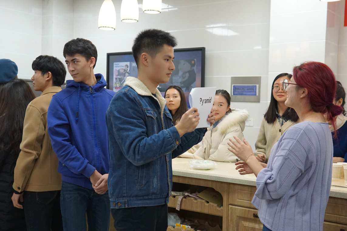 接下来,在等待饺子出锅的过程中,主持人带领大家玩了“传声筒”的游戏。每个小组由中国员工和职工组成,第一位同学将看到的英语单词用肢体语言表现出来,后面的组员依次模仿,最后一位同学根据猜测将该单词说出来。游戏过程中,中外同学配合默契,进展顺利,现场气氛被推向高潮。