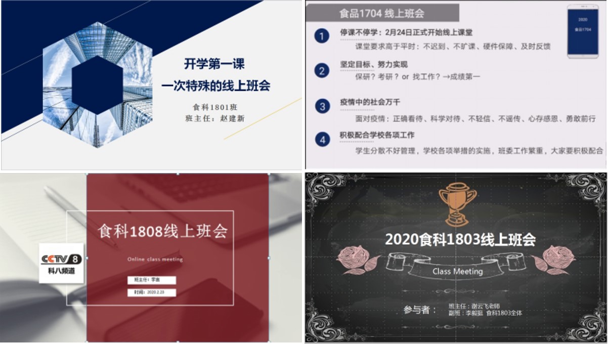 为了召开班会,班主任们纷纷化身“网络主播”,提前通知组织、下载软件调试、与班委商议内容;有的老师为实现班会效果,特地准备了高清的摄像头和麦克风;赵建新、谢云飞、于静洋、李言等几位老师为提升线上班会效果,帮助同学理解,还制作了班会PPT。在加拿大探亲的王文龙老师,为了配合国内同学的时间,很少熬夜的他,当地时间23:00仍在与班级连线,一向以“幽默”著称的王老师,还走心地在中国地图上标出了班里32的员工的位置,说这是“食质1902的地图”。