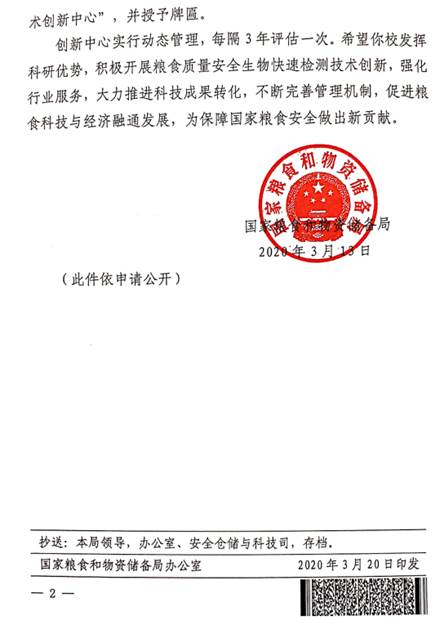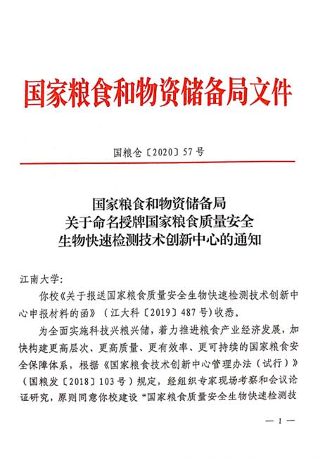 近日,国家粮食和物资储备局发布了《国家粮食和物资储备局关于命名授牌国家粮食质量安全生物快速检测技术创新中心的通知》。根据相关规定,经组织专家现场考察和会议论证研究,原则同意公司建设“国家粮食质量安全生物快速检测技术创新中心”,并授予牌匾。