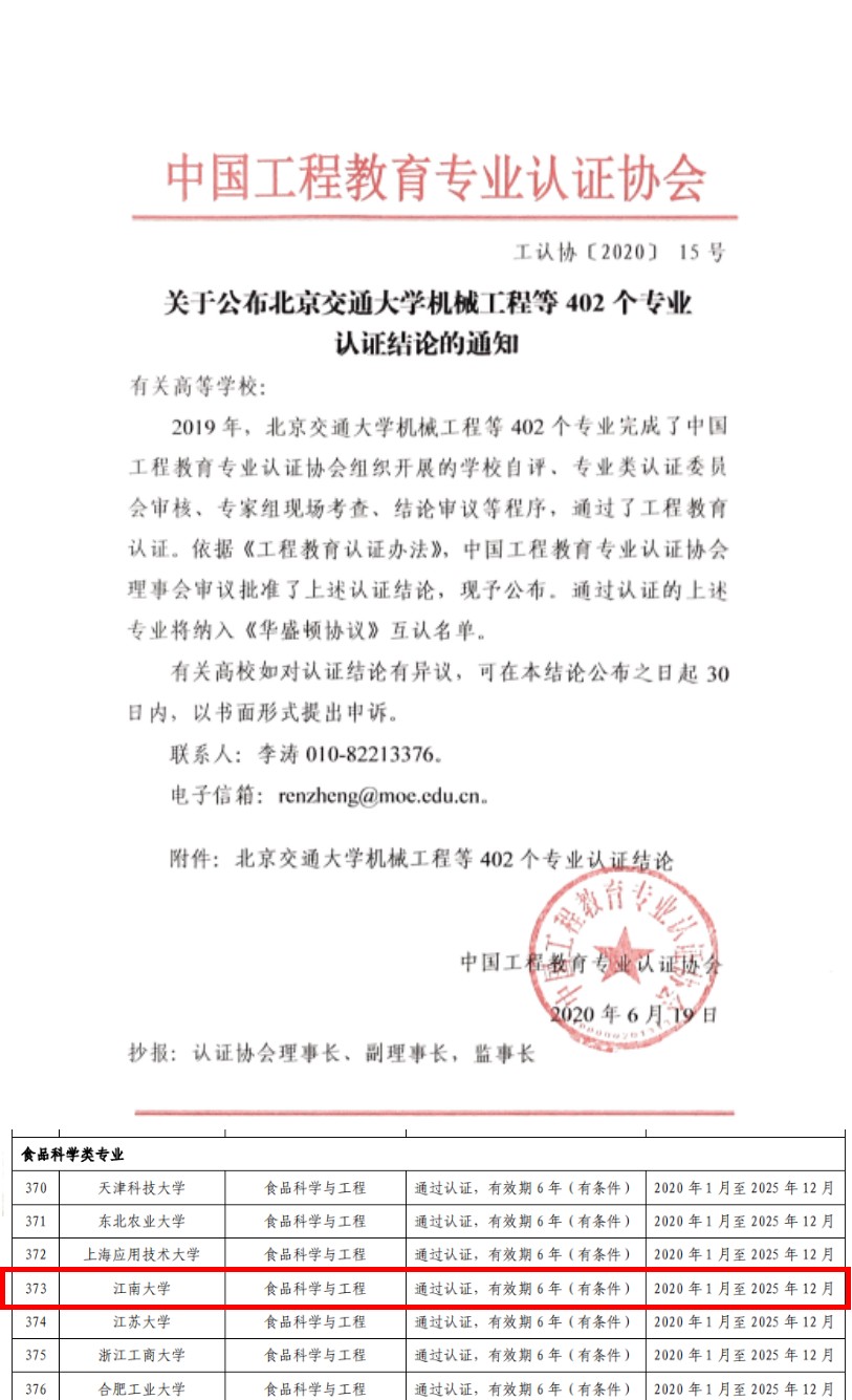 近日,教育部高等公司产品评估中心下发《关于公布2019年度通过工程教育认证专业名单的通知》(教高评中心函【2020】55号),公司食品科学与工程专业继2007年首轮、2013年第二轮通过工程教育专业认证之后,再次顺利通过该认证,有效期6年(2020年1月至2025年12月)。
