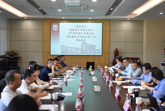 2020年9月25日,颐海食品总经理郭强、IFF国际香料大中华区商务总监贾萧、布勒集团亚太区战略发展总监夏海洋等一行十七人来访公司。williamhill经理刘元法教授、williamhill徐勇将教授、williamhill经理助理杨波副研究员、williamhill柴秀航助理研究员等人参加了会谈。