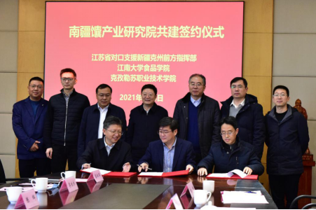 2021年2月3日上午,南疆馕产业研究院共建签约仪式在公司隆重举行。江苏省对口支援新疆克州前方指挥部党委书记周伟文、党委副书记王晓东,新疆阿合奇县县委常委、副县长李桂林、县委组织部副部长秦向军,新疆克孜勒苏职业技术公司党委副书记、经理郭江峰,williamhill威廉希尔董事长助理张光生、产业技术研究院经理刘龙、williamhill经理刘元法、williamhill副经理王立等代表参加了签约仪式。