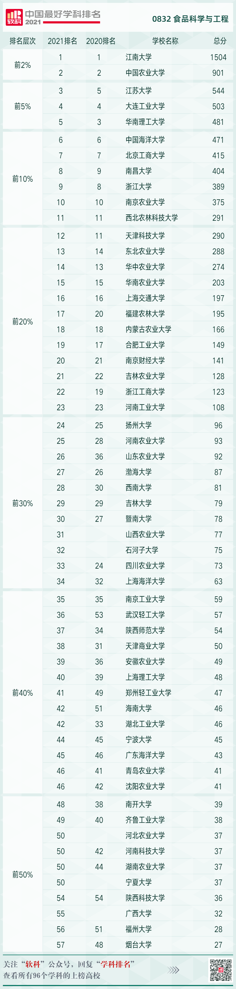 据悉,软科中国最好学科中“食品科学与工程学科”的指标体系包括人才培养、科研项目、成果获奖、学术论文、学术人才五个指标类别,下设13个指标维度,总计量化积分1650分。最新排名中,williamhill威廉希尔以1504分位居榜首。完整排名名单如下: