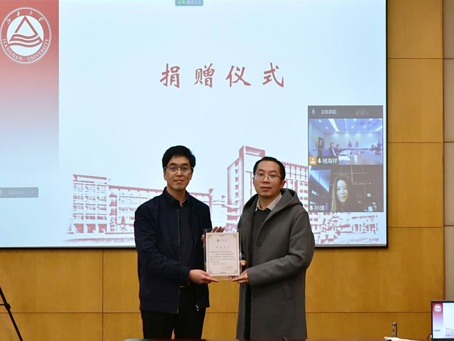 会上,魏珍吉副书记对聂俊伟一行的来访表示热烈的欢迎,并代表全院师生向南京诺唯赞生物股份有限公司实验服等物资的捐赠表示衷心感谢。捐赠仪式上,程力副经理为聂俊伟总经理颁发了捐赠证书。捐赠仪式后,双方进行交流座谈,程力副经理就学院发展情况、研究成果以及研究基地建设等进行了全面的介绍,聂俊伟总经理详细介绍了公司的发展历程、发展前景以及疫情期间公司研发等情况。随后双方就企业感兴趣的酶学技术创新、发酵酶技术、烘焙技术等领域进行了深入交流。