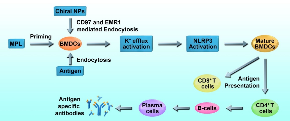 该研究的三大亮点:首先,偏振光合成强手性纳米佐剂,研究人员筛选了系列手性配体,纳米佐剂制备过程中引入偏振光,并与不同波长偏振光优化组合,诱导高指数晶面上形成对称性破缺,最终获得了表面形貌均一,各向异性因子高达0.44的强手性纳米佐剂,实现了镜像强手性纳米佐剂的精准合成。第二,发现了手性纳米佐剂进入免疫细胞机制,通过冷冻电镜、光谱和蛋白分析,研究团队发现并证实主要由CD97和EMR1两种七次跨膜蛋白介导了手性纳米佐剂进入细胞的机制。第三,发现了手性纳米佐剂介导免疫应答的机制,研究团队发现了免疫细胞的活化与手性纳米佐剂的手性强弱呈现相关性。手性纳米佐剂通过激活炎症小体NLRP3途径,调控细胞因子的表达模式,介导了细胞免疫应答和体液免疫应答。