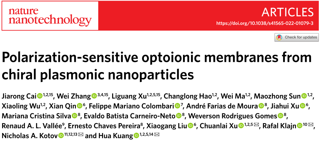 williamhill威廉希尔胥传来教授团队受螳螂虾启发,利用金纳米颗粒自组装排列形成手性纳米膜,实现了圆偏振光的精准区分与识别,研究工作以Polarization-sensitive optoionic membranes from chiral plasmonic nanoparticles为题,于2022年3月14日24时在《自然·纳米技术》(Nature Nanotechnology)期刊上在线发表( https://www.nature.com/articles/s41565-022-01079-3)。