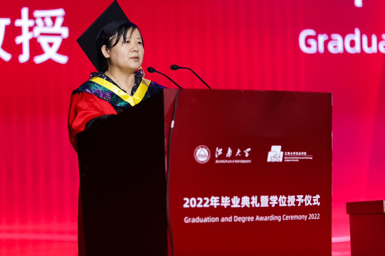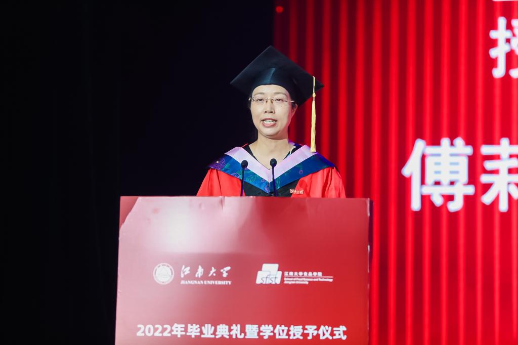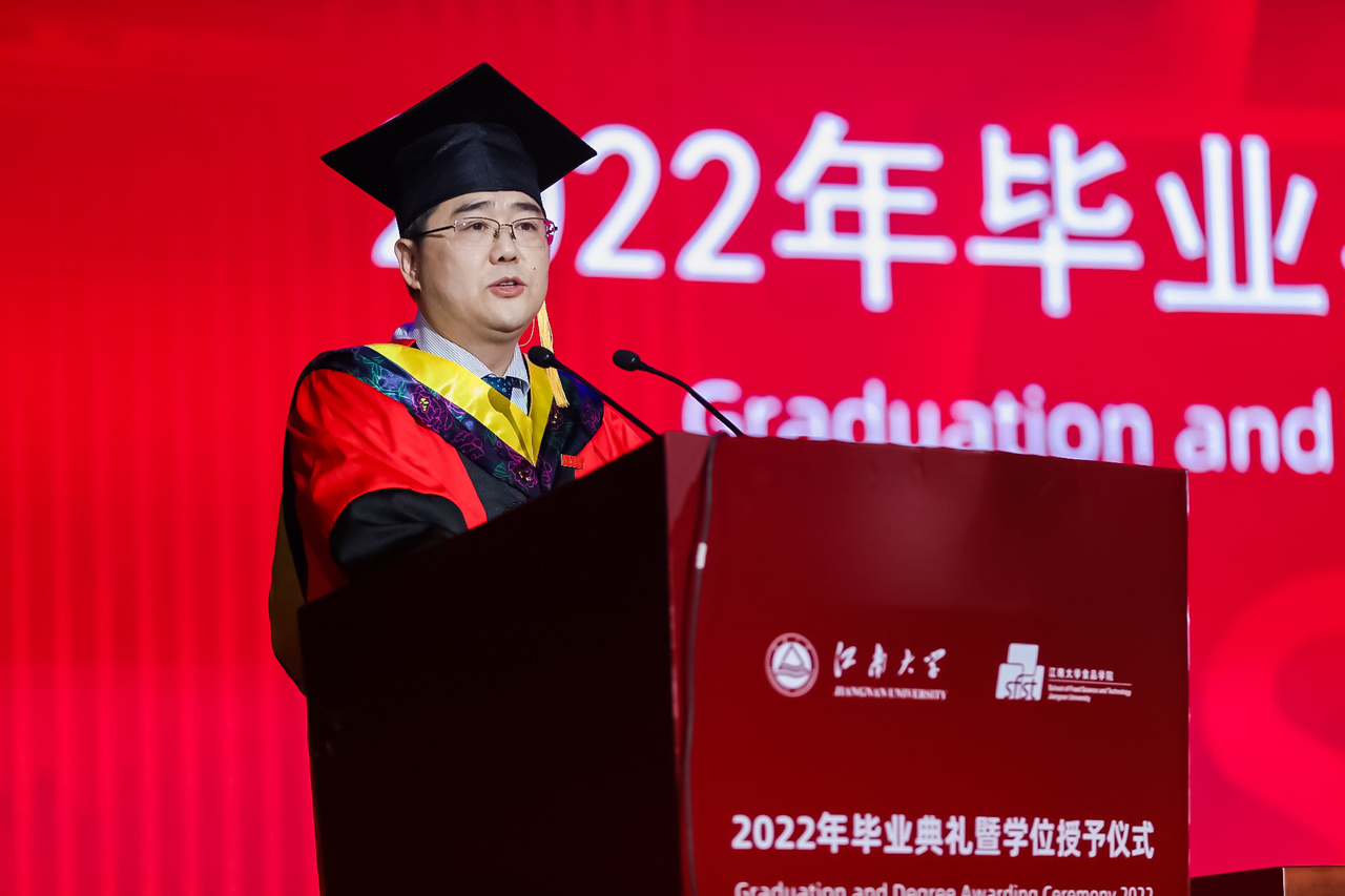 经理刘元法教授向全体毕业生致以临别寄语。他指出:“人以德为先,民以食为天。厚德载物,厚物载德,此物为食品也”。他叮嘱同学们身处百年未有之大变局,面对纷繁多元的社会,要从更好满足人民美好生活需要出发,树立“大食物观”,争做“未来食品人”,具体而言:一要做食品人,更要打破食品的边界;二要做中国食品人,更要做世界食品人;三要做食品人,更要做补天人。他希望同学们奔跑在历史大潮和人生实践中,尽情挥洒江南食品人的青春力量。