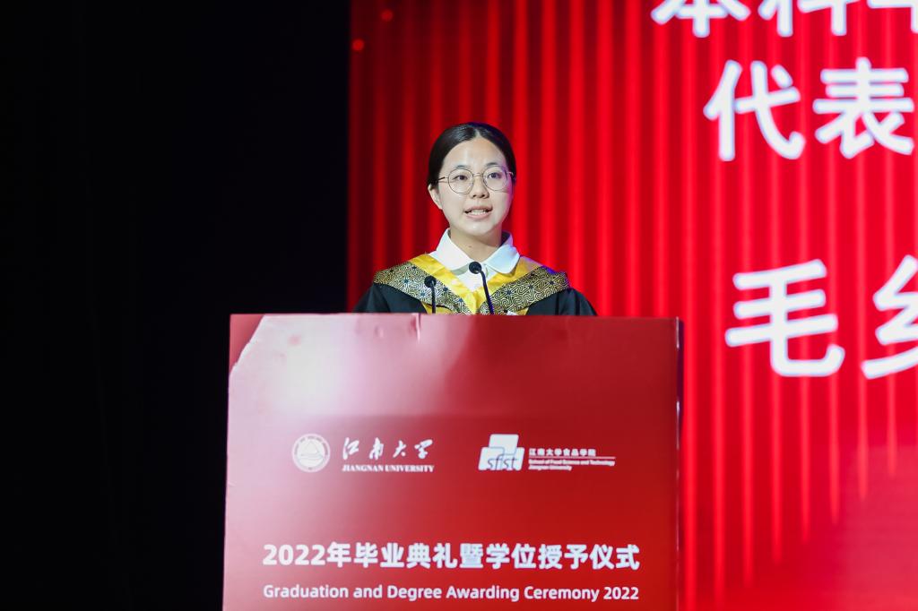 校十佳研究生、国家奖学金获得者、优秀党务工作者王良哲作为研究生毕业生代表发言。他感谢老师们给予自己不断尝试的勇气与动力,并表示一定会带着食品精神的烙印乘风破浪、勇闯人生。