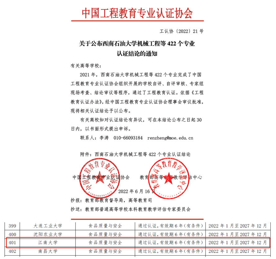 近日,中国工程教育专业认证协会正式公布了《关于公布西南石油大学机械工程等422个专业认证结论的通知》(工认协[2022] 21号),公司食品质量与安全专业顺利通过该认证,有效期6年(2022年1月至2027年12月),成为全国首批通过认证的同类专业之一。