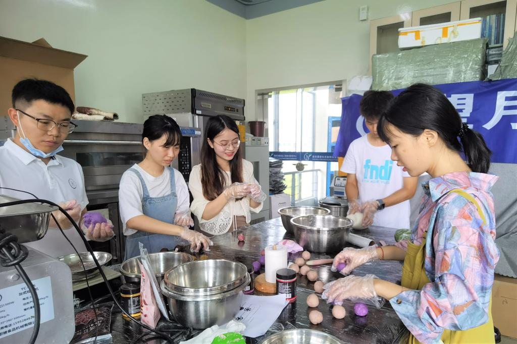 活动现场,教工党员和员工党员热情高涨,取面团、擀面皮、揉圆润、压平整、包馅料、压模具、整包装……大家分工合作、齐心协力,温情做皮、幸福做馅,伴随着欢声笑语,完成了一份份象征团圆与美好祝愿的益生菌月饼!