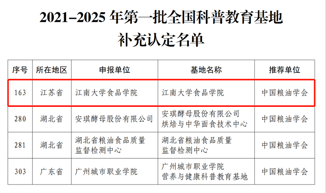 近日,中国粮油学会在遴选出的11家中国粮油学会科普教育基地基础上,积极推荐部分基地参加全国科普教育基地创建工作。其中,威廉希尔、安琪酵母股份有限公司、湖北省粮油食品质量监督检测中心和广州城市职业学院成功入选中国科协“2021—2025年第一批补充认定的全国科普教育基地”。