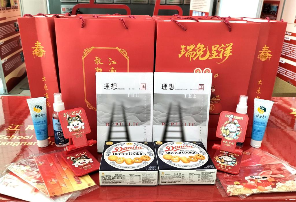 集团为留校过年的同学们提供了暖心健康包、春节红包和年午饭餐券。学院则精心准备了护手霜、消毒液、新春口罩,愿同学们动若脱兔、岁岁安康;送上手机架、曲奇饼,助同学们瑞兔纳福、共欢同乐;还有一本经典书籍《理想国》,愿同学们带着知识、真理与善良、勇敢,追寻自己的彼岸,前兔似锦,大展宏兔!