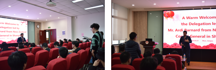 3月21日下午,新西兰驻沪总领事Ardi Barnard和政策顾问Maggie Shen一行2人应邀来公司进行交流访问。无锡市外办副主任叶诤、williamhill威廉希尔国际交流合作处副处长蔡建英、公司党委副书记、副经理李雷、副经理谢云飞教授、经理助理徐勇将教授、经理助理吕小妹教授等教师代表,以及中外合作办学项目大三全体员工参加了此次座谈交流。座谈会由williamhill副经理谢云飞主持。