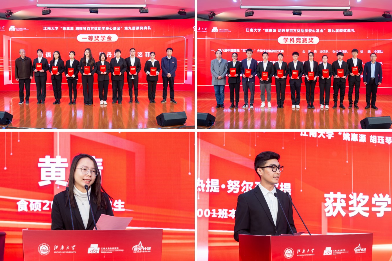 魏珍吉宣读2022年度“姚惠源∙胡珏琴百万奖助学爱心基金”获奖名单。共有36人获奖学金,40人获助学金,48支团队获学科竞赛奖励,奖助总金额超40万元。在场嘉宾为124名荣获奖助的同学分批次颁发荣誉证书。2021级硕士生黄晴、2020级本科生艾力木热提·努尔买买提作为员工代表先后发言,感恩姚惠源教授的大爱无私,感谢全体捐赠人的厚爱与期望。