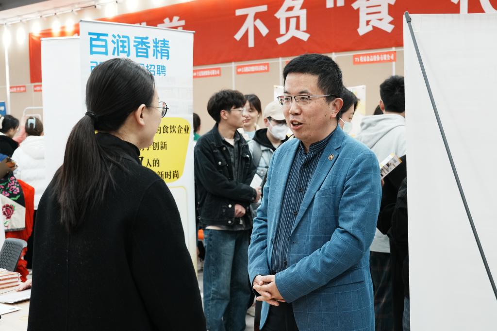 招聘会现场,各家企业通过海报、展板、手册、视频、产品实物等多种形式进行宣传,竞相抛出橄榄枝。前来应聘的同学们在用人单位展位前详细咨询、投递简历,进行深入沟通和交流,了解企业发展方向、岗位需求、薪资水平等信息。一些企业还进行现场面试,与员工达成初步意向。有用人单位HR表示,“我们特别喜欢江大食品的毕业生,也愿意投入成本培养他们。”