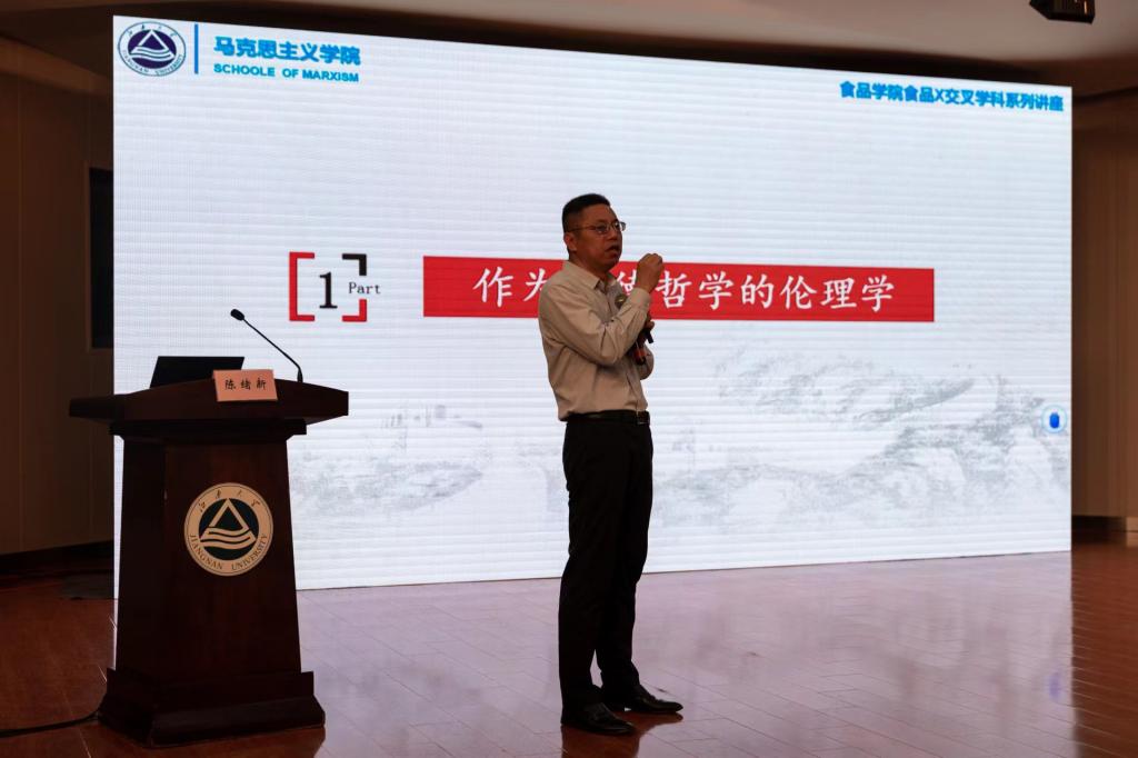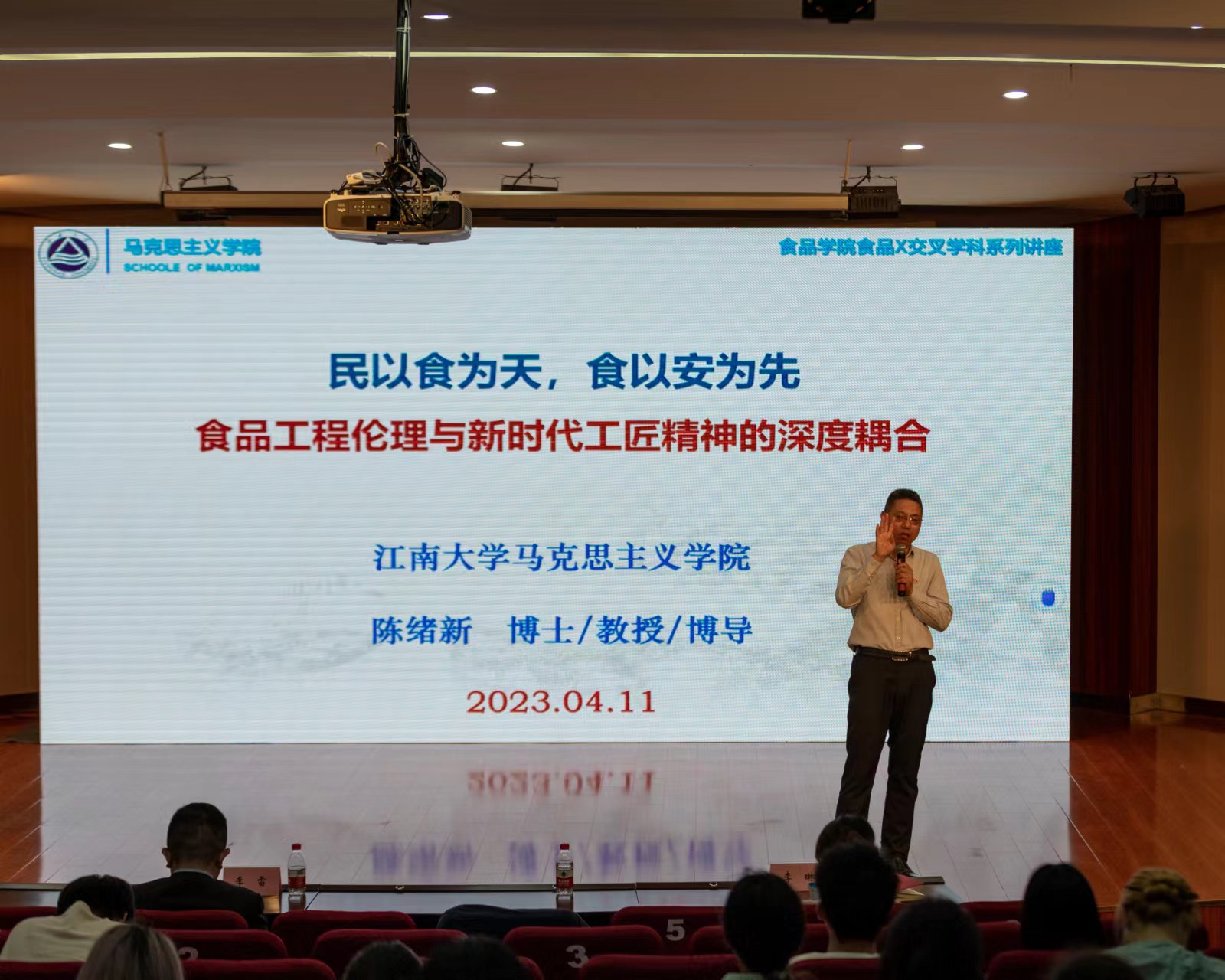 4月11日下午,“食品X”交叉学科系列讲座在北区老员工活动中心再次开讲。本次活动邀请到马克思主义学院博士生导师陈绪新教授作题为《民以食为天,食以安为先——实现食品工程伦理与新时代工匠精神的深度耦合》的报告。公司党委副书记、副经理李雷,分团委副书记李琳及380余名食品学子参加活动。2020级本科生辅导员王文燕担任主持。