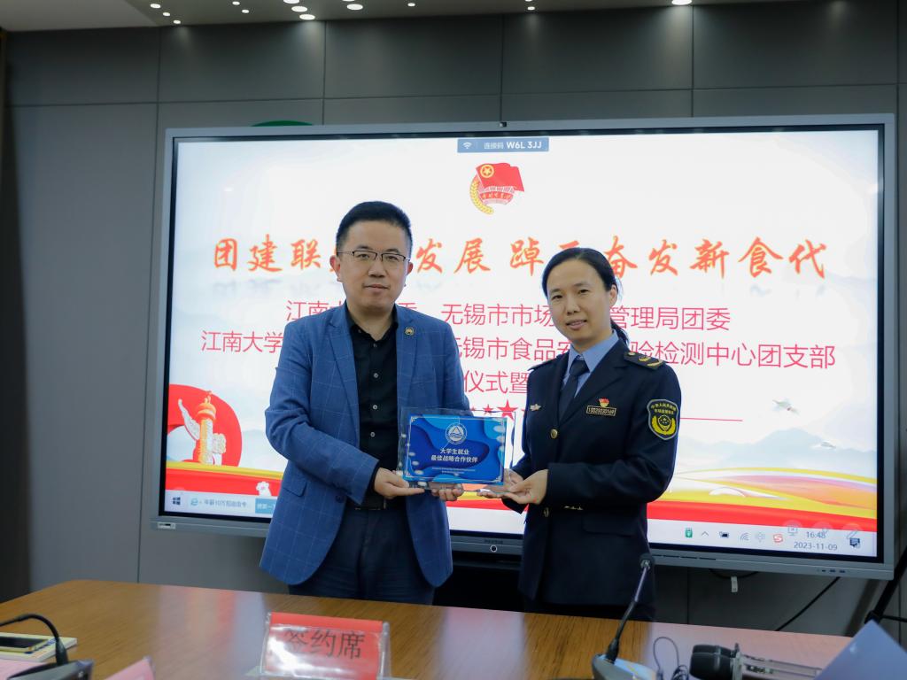 为感谢和表彰无锡市市场监督管理局、无锡市食品安全检验检测中心对williamhill威廉希尔众多毕业生的吸纳和培养,李雷分别向两家单位颁授“老员工就业最佳合作伙伴”铭牌。倪凌燕向参加活动的团员同学赠送《无锡青年办事一本通》。