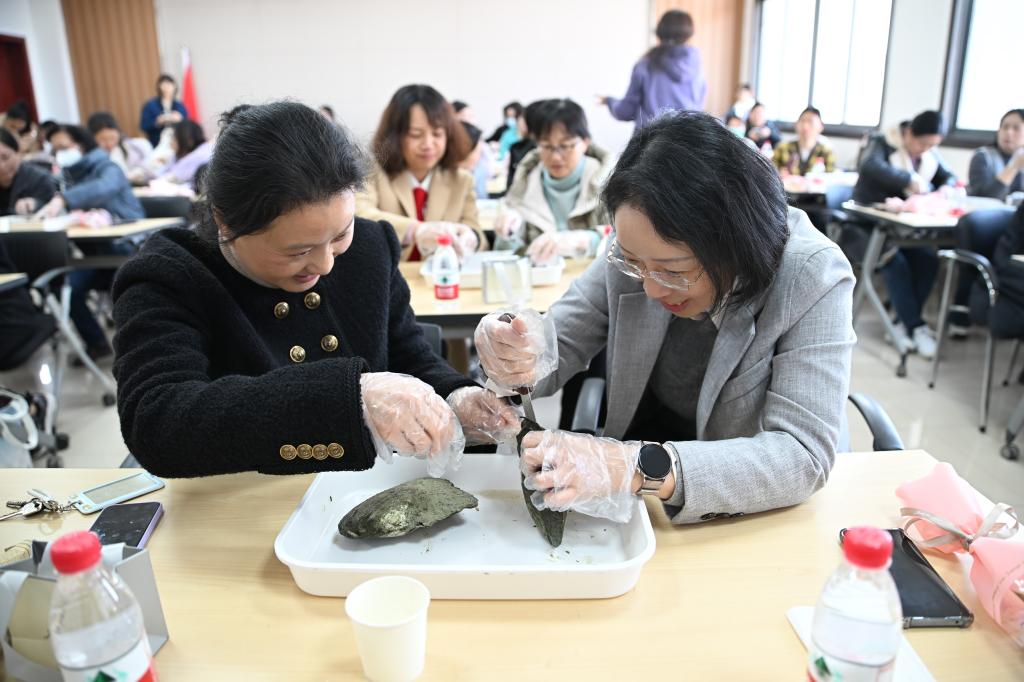 活动伊始,工艺师为大家分发了珍珠蚌和制作工具,详细讲述了珍珠的基本知识以及珍珠饰品的制作步骤。在工艺师的指导和帮助下,大家使用专业工具进行开蚌。当珍珠蚌打开的瞬间,一颗颗珍珠让人眼前一亮,引来了大家的阵阵欢呼声,现场气氛热烈欢快。通过洗珠、浸泡、抛光、打孔、粘合等过程,再根据珍珠的样式、色彩选择配饰,一件件精美的珍珠饰品在老师们手中诞生。