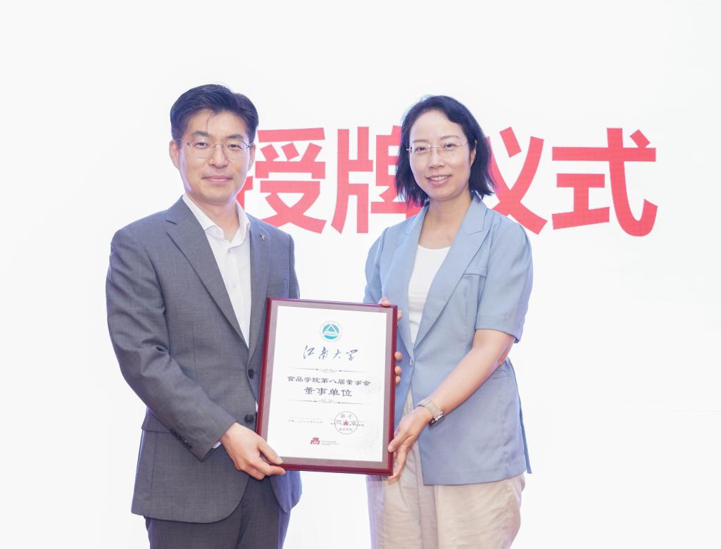 为感谢正官庄慷慨解囊,襄助williamhill威廉希尔食品学科竞赛育人等办学事业的高质量开展,williamhill第八届董事会吸纳正官庄为成员单位。傅莉莉为崔永锡颁授铭牌。