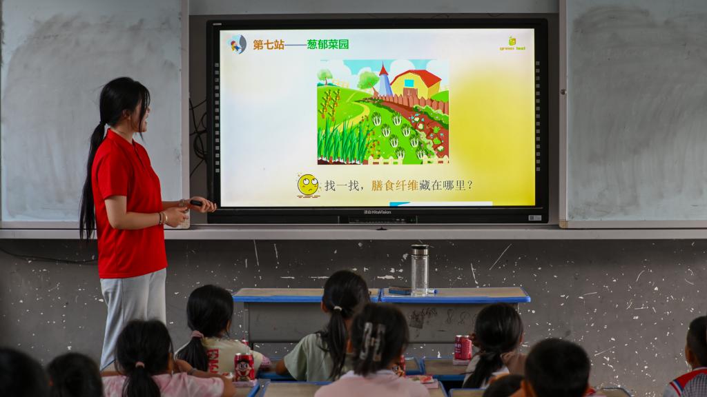 7月17日,师生们来到从江县独洞村,结合当地现状,为独洞小学的小朋友们带来一堂以“健康大冒险”为主题的科普食育课程。实践团成员、课程主讲人肖雨蕊带领少数民族的小员工们一起学习蛋白质、脂肪、糖类和膳食宝塔基本营养科学知识,指导大家进行合理膳食搭配,提升食品营养与健康。