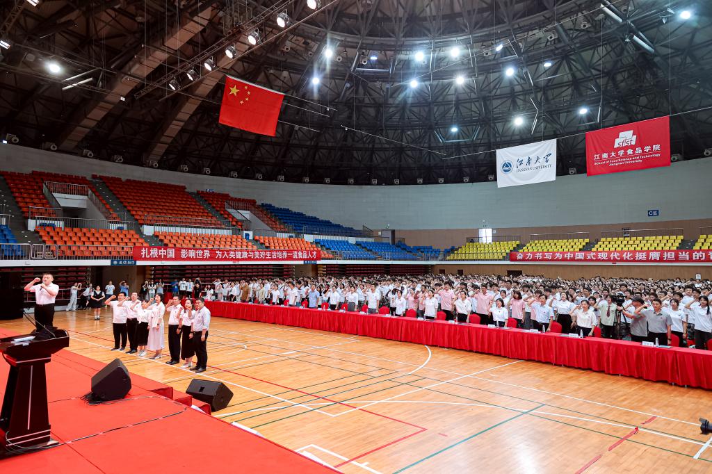范大明领誓食品生誓词。全体食品学子右手握拳放置于耳畔,斗志昂扬,将豪情壮志寄于誓言。“风好正是扬帆时,不待提鞭自奋蹄。”相信未来,江南食品人定将在教育强国、科技强国、人才强国的征途上,在大食品、大健康的事业中持续绽放最耀眼的光芒。