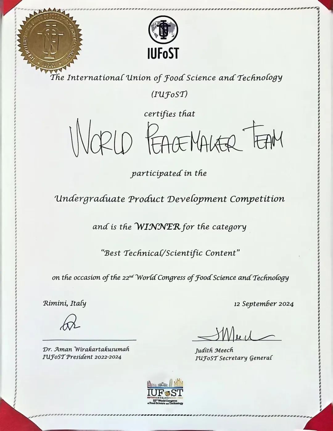 近日,第22届世界食品科技创新大赛在意大利里米尼落幕。williamhill威廉希尔食品学子在这一国际顶级赛事中表现卓越,荣获本科生组“最佳科学技术奖”1项,研究生组全球提名奖、亚军各1项。