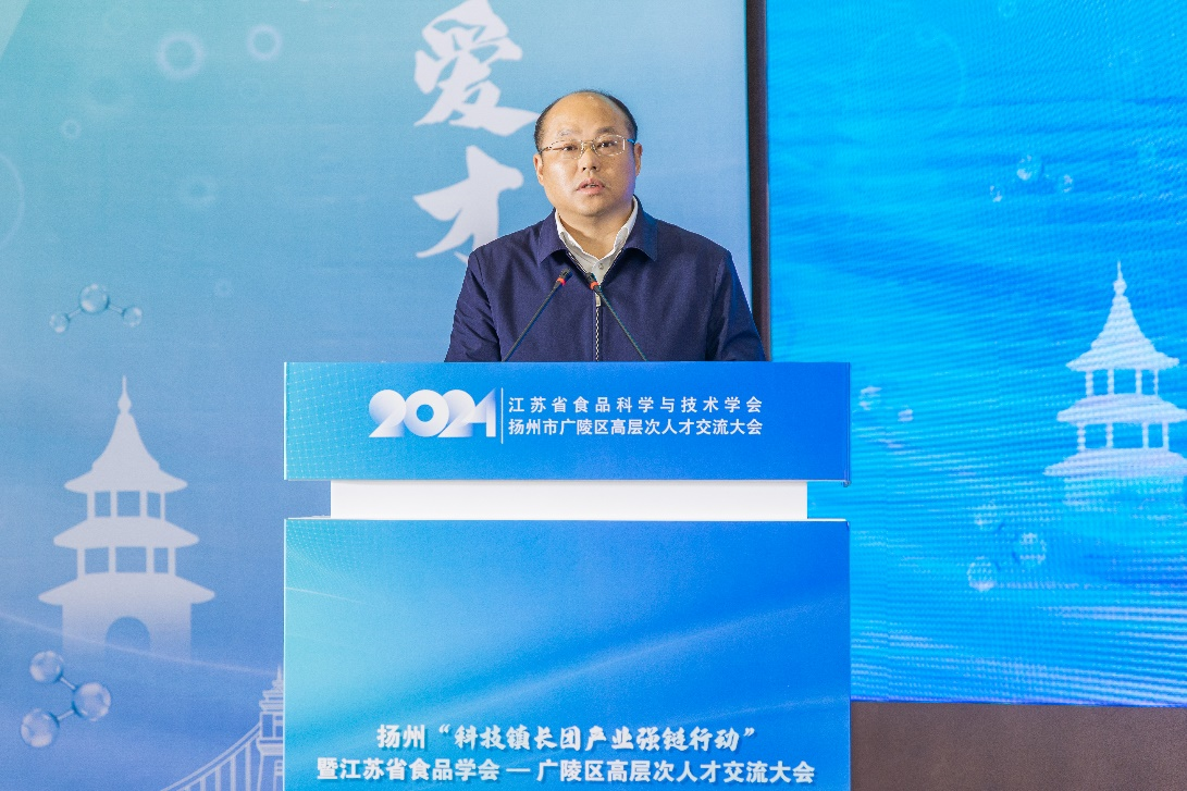 顾正彪在致辞中强调,当前江苏省食品行业管理部门和地方政府正在不断加强政策支持,加大研发投入,致力于培养创新人才,推动产业协同创新。江苏省食品科学与技术学会自成立以来,始终致力于推动江苏由“食品大省”向“食品强省”转变,通过学术交流等方式助力行业发展。2022年,长三角食品产业创新合作联盟扬州基地落户广陵,有力推动了园区企业技术创新。学会也将进一步发挥资源优势,深化与广陵合作,为推动食品产业高质量发展聚智汇力、赋能增效。