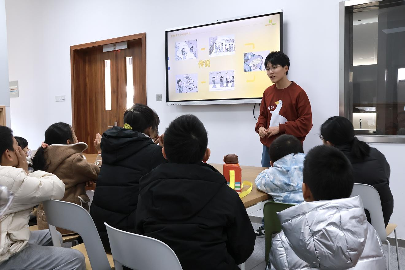活动以猜谜的形式拉开序幕。来自青芽食育的老员工科普教员通过提问引导孩子们思考饺子的起源和文化寓意,激发了他们对传统美食的浓厚兴趣。随后讲解的是饺子的历史渊源,从东汉时期的“娇耳”到如今的饺子,孩子们听得津津有味,对饺子的文化背景有了更加深入的了解。课上还介绍了饺子的营养元素,通过趣味连线的方式让孩子们学会辨识饺子的食品配料表和营养标签等实用知识。