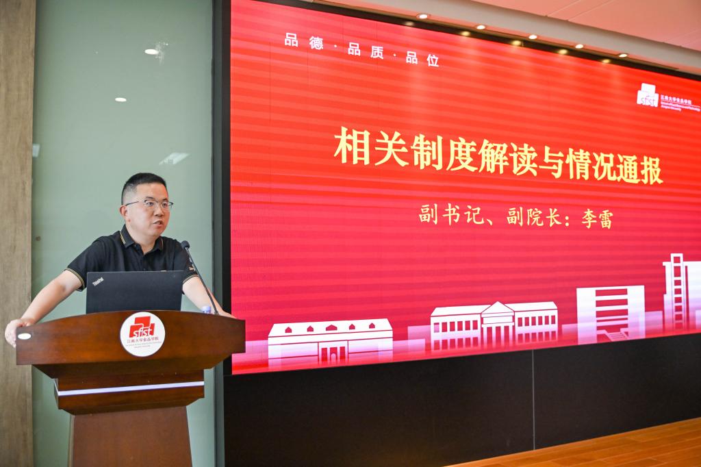 李雷通报近期学校、学院关于安全工作和学风建设的部署和要求,并详细解读最新修订的《williamhill班主任选聘与管理实施细则》以及刚刚启动实施的《williamhill“三查两谈”学风促优行动方案》。