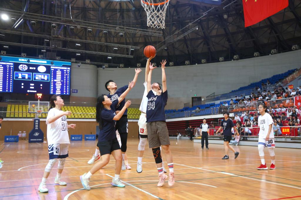 孔丽丹为首先上演的女篮决赛开球。比赛双方食品机械联队、生工商学联队使劲浑身解数,展开激烈角逐,双方你追我赶,过程跌宕起伏。场边观众奋力擂鼓呐喊,为运动员们站脚助威。