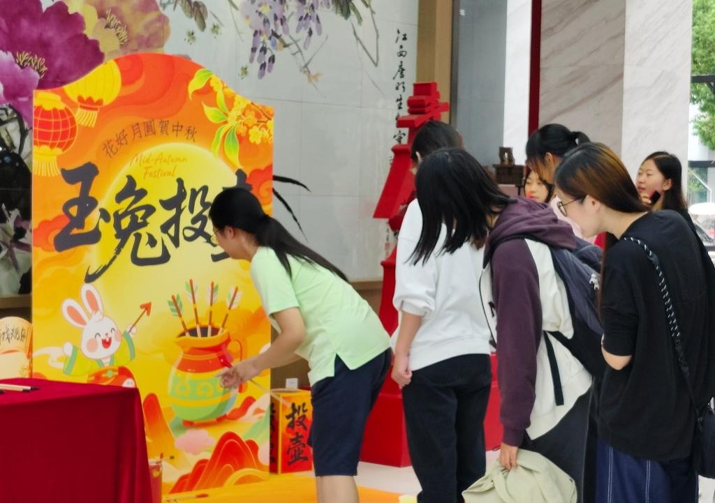 公司一楼的投壶活动区气氛热烈,箭矢落壶的清脆声响与阵阵喝彩交织。月饼抱枕、玉兔书签、清雅香囊……每一份礼品都承载着惊喜,每一次尝试都迸发着欢笑。传统游艺与现代校园和谐相融,织就这个中秋最热烈的记忆场景。