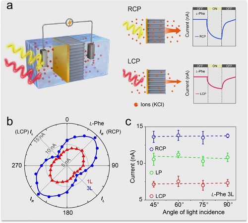 研究团队联合美国密歇根大学教授Kotov、以色列魏兹曼研究所教授Klajn,对手性金膜区分圆偏振光的机制进行了深入研究。结果发现,在左旋和右旋圆偏振光照射下,手性金纳米膜被激发的电子数量存在明显差异。苯丙氨酸配体在金纳米颗粒表面形成有机层,使得光照下的电子衰减被有效抑制,在金纳米膜两侧形成电势差,从而驱动离子运输产生光电流。
