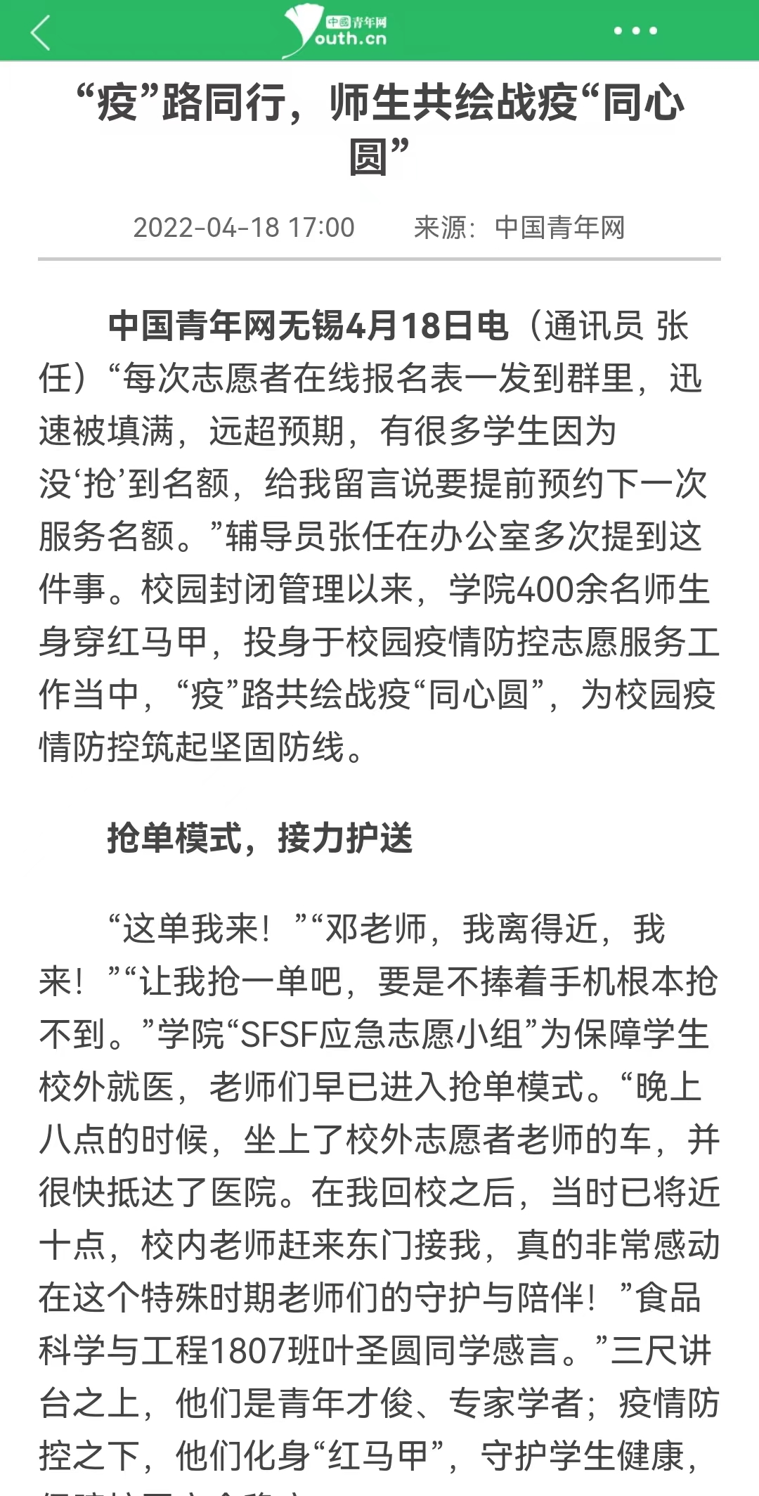 【中国青年网无锡4月18日电】(通讯员 张任)“每次志愿者在线报名表一发到群里,迅速被填满,远超预期,有很多员工因为没‘抢’到名额,给我留言说要提前预约下一次服务名额。”辅导员张任在办公室多次提到这件事。校园封闭管理以来,学院400余名师生身穿红马甲,投身于校园疫情防控志愿服务工作当中,“疫”路共绘战疫“同心圆”,为校园疫情防控筑起坚固防线。