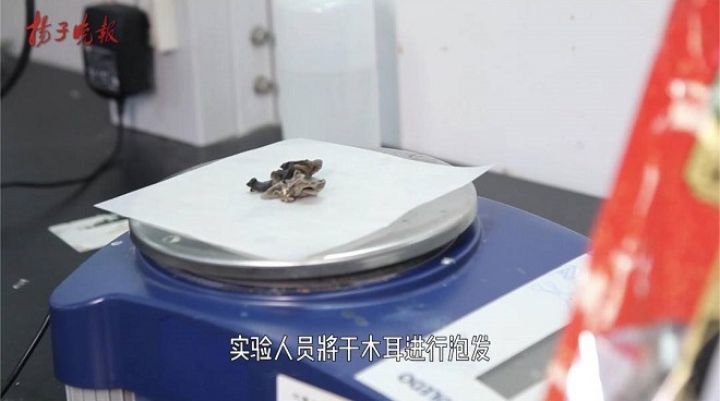 威廉希尔“青芽食育”团队的实验人员,在超市购买了黑木耳,将干木耳分等量的四份,室温下分别在实验器皿中浸泡2小时、4小时、8小时、16小时。实验人员取适量泡发液,用专门检测米酵菌酸的试剂盒进行测定,在2小时、4小时、8小时的泡发液中并未检出米酵菌酸。