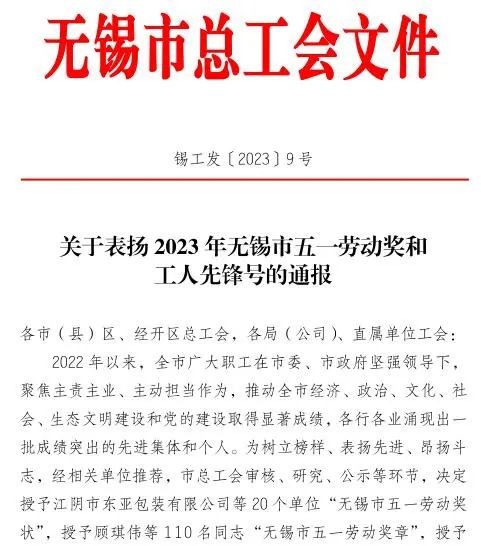 《关于表扬2023年无锡市五一劳动奖和工人先锋号的通报》